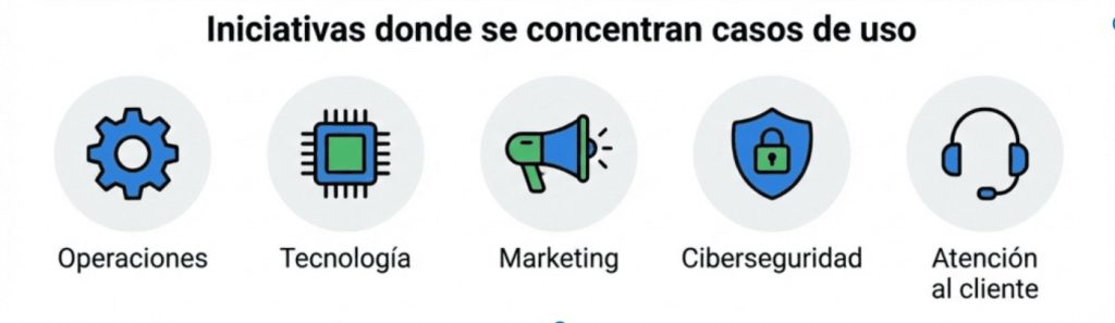 A pesar de las brechas, los resultados preliminares permiten identificar focos concretos de avance. Los casos de uso más maduros se concentran en operaciones, tecnología, marketing, ciberseguridad y atención al cliente. Se estima que más del 50 % de las iniciativas más avanzadas proviene de estas funciones.