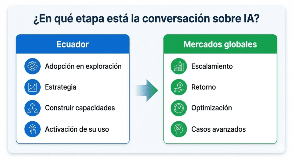 Al comparar los resultados preliminares de Ecuador con los resultados globales, encontramos que mientras en otros mercados la conversación ya gira en torno al escalamiento, el retorno y la sofisticación de los casos de uso, en Ecuador la adopción avanza todavía a ritmo de exploración. Y frente a contextos donde predominan preocupaciones regulatorias y de riesgo, en Ecuador persisten desafíos fundamentales de estrategia, talento y activación del uso.