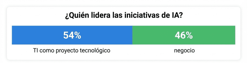 Este hallazgo es remarcado por el hecho de que la mayoría de las empresas (54%) siguen viendo las iniciativas de IA como proyectos del área de tecnología, lo cual limita la visión de los negocios por transformar su operación hacia ámbitos más competitivos, como lo están haciendo empresas globales, igualmente encuestadas.