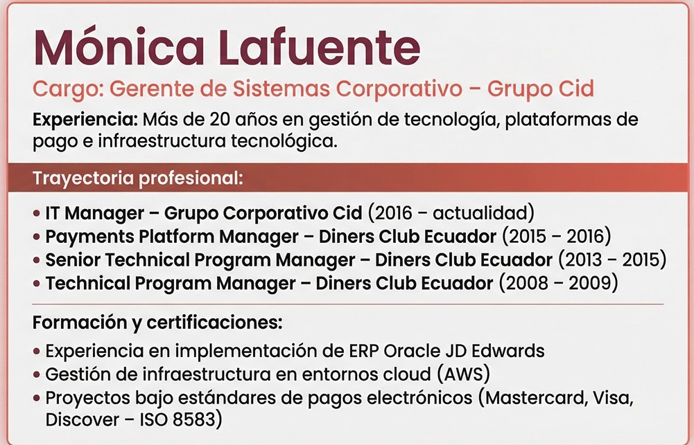 Con experiencia en plataformas de pago, gestión de sistemas e infraestructura tecnológica, Mónica Lafuente ha desarrollado una trayectoria de más de 20 años en la implementación de soluciones que soportan la operación y la toma de decisiones en entornos corporativos. Actualmente lidera el área de IT del Grupo Corporativo Cid.